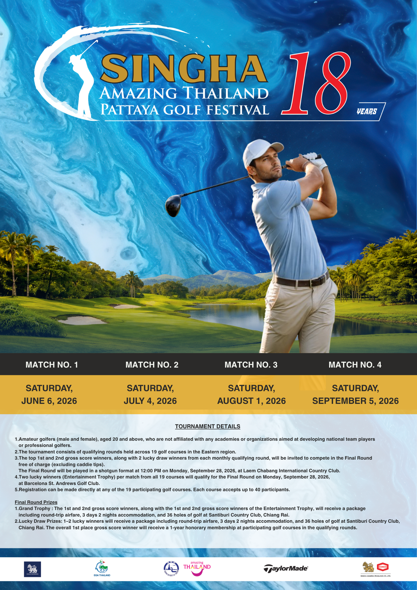 Singha Amazing Thailand Pattaya Golf Festival (ปีที่ 18) มหกรรมกอล์ฟสมัครเล่นที่ใหญ่ที่สุดในภาคตะวันออก ร่วมกับพันธมิตร 19 สนามชั้นนำทั้งในภูมิภาคและกรุงเทพฯ เพื่อพัฒนานักกอล์ฟสมัครเล่นให้ก้าวสู่มาตรฐานสากล …ข่าวสมาคม / 24/04/2026 Singha Amazing Thailand Pattaya Golf Festival (ปีที่ 18) มหกรรมกอล์ฟสมัครเล่นที่ใหญ่ที่สุดในภาคตะวันออก ร่วมกับพันธมิตร 19 สนามชั้นนำทั้งในภูมิภาคและกรุงเทพฯ เพื่อพัฒนานักกอล์ฟสมัครเล่นให้ก้าวสู่มาตรฐานสากล